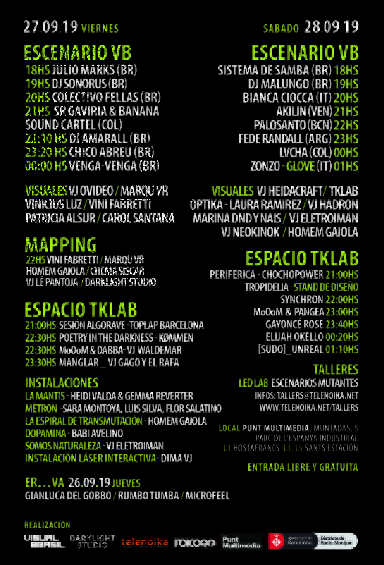 El Festival VISUAL BRASIL realizará su décimoséptima edición los días 27 y 28 de septiembre de 2019 en el Punt Multimèdia, centro dinamizador de proyectos multimedia y tecnologías digitales, situado en la Casa del Mig del Parc de la Espanya Industrial de Barcelona.